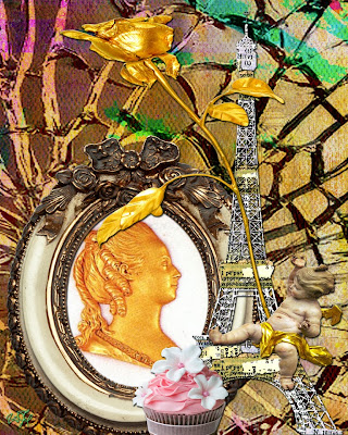 I decided to alter the colors of the background and add my favorite Eiffel Tower element I've used in several digital collages. This is the new art I ended up with: